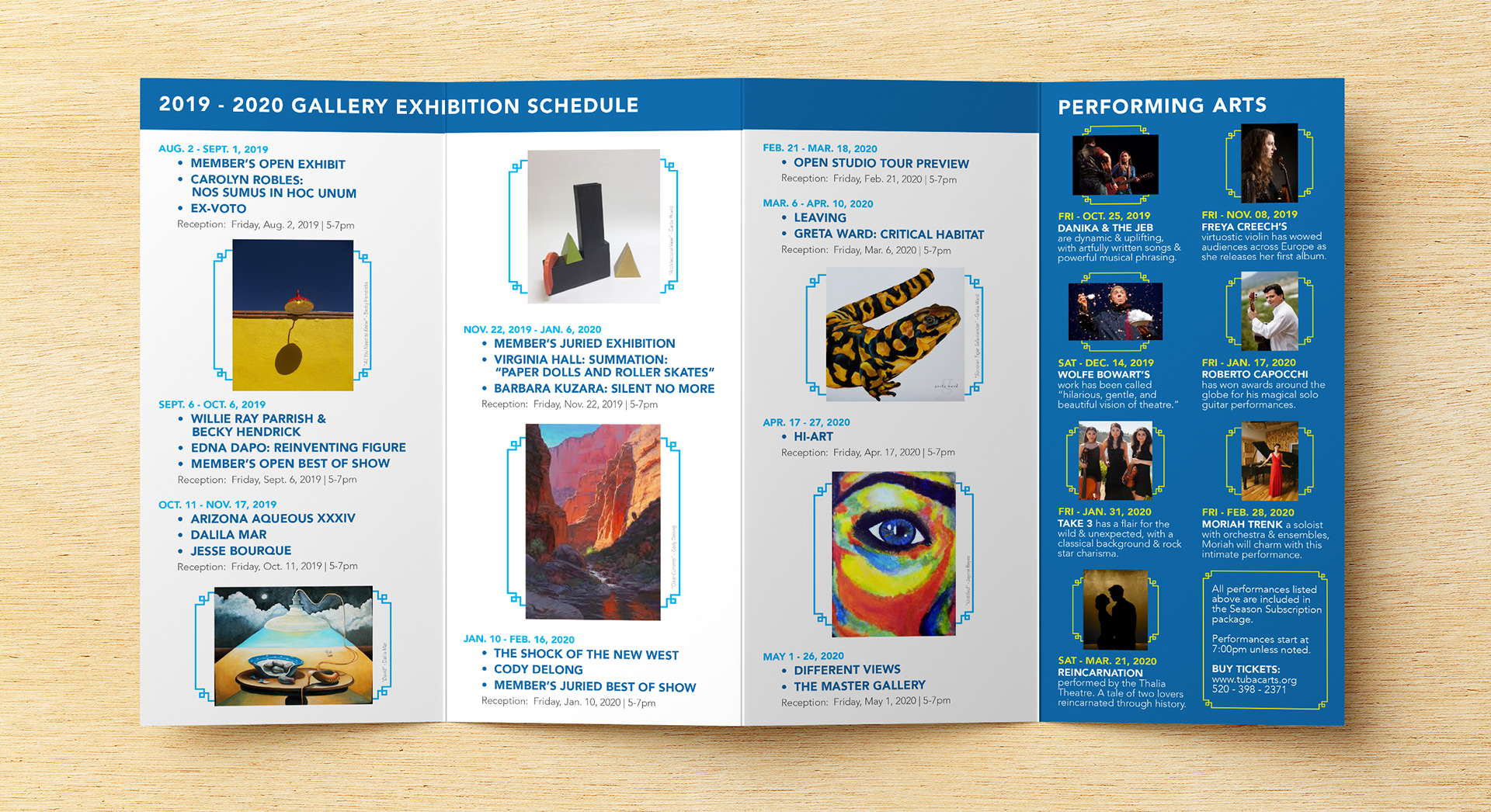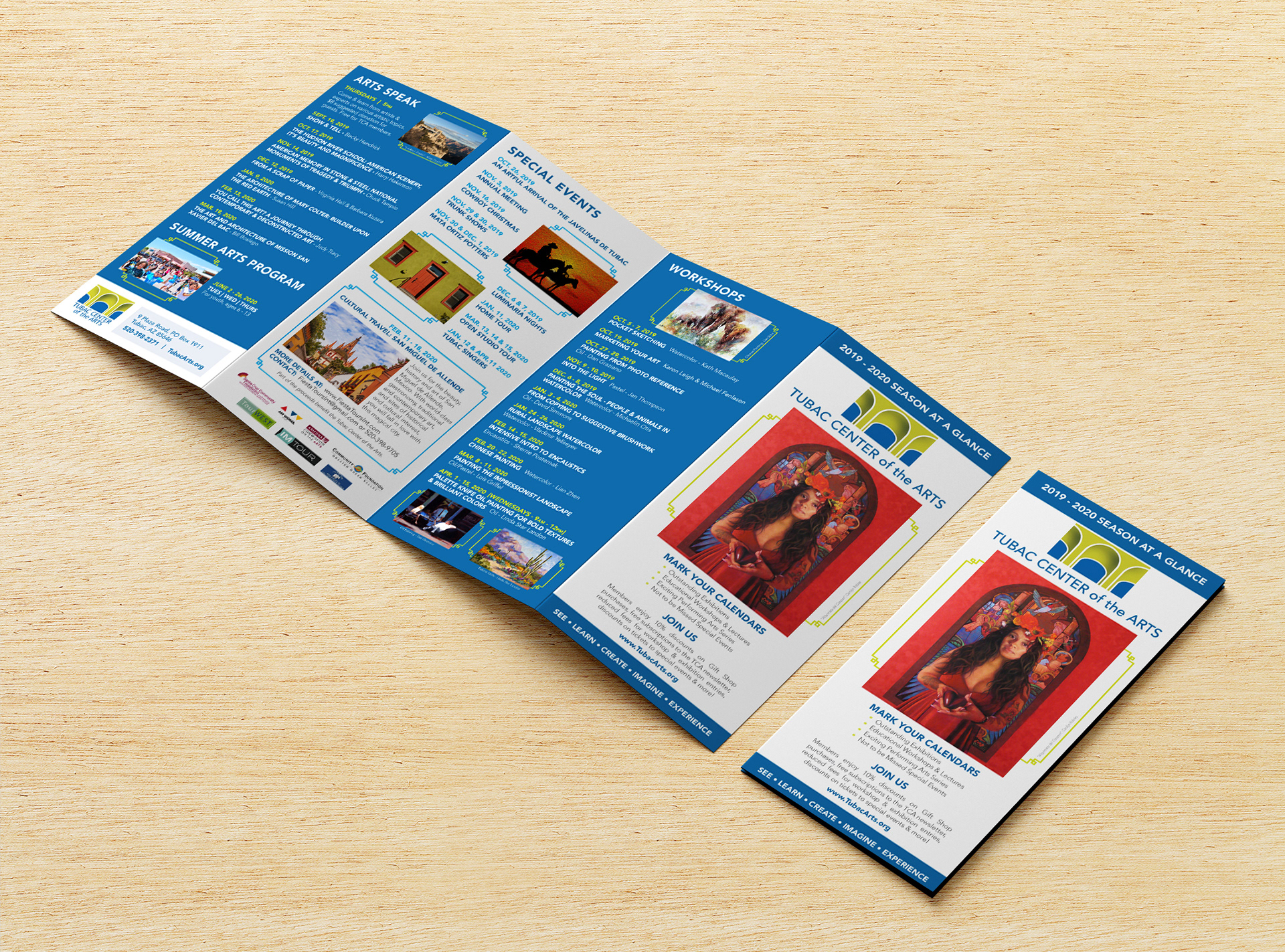 16" x 9" quarter-fold brochure featuring upcoming exhibitions, events, and workshops